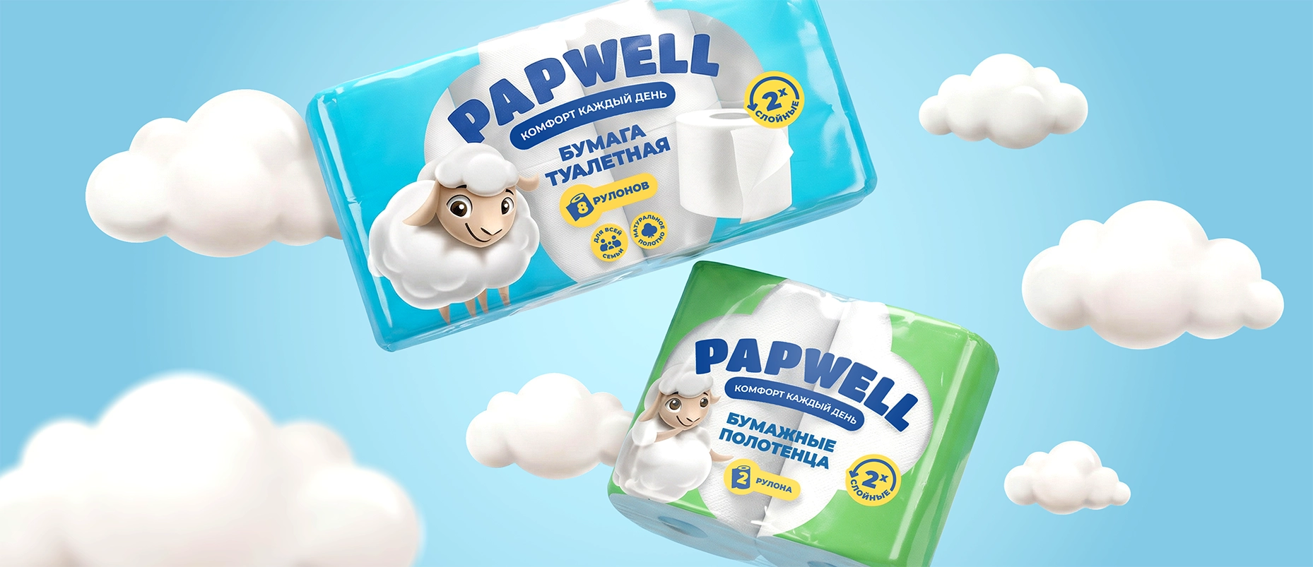 Команда A.STUDIO провела анализ рынка и конкурентов, уделив особое внимание изучению универсальных ходов в категории. Мы установили, что большинство брендов делают акцент на функциональных характеристиках продукта, например, таких как количество слоев или ароматические отдушки, а потребители останавливают свой выбор на товарах, которые предлагают позитивные эмоции и ассоциации с комфортом. В результате был разработан бренд Papwell.