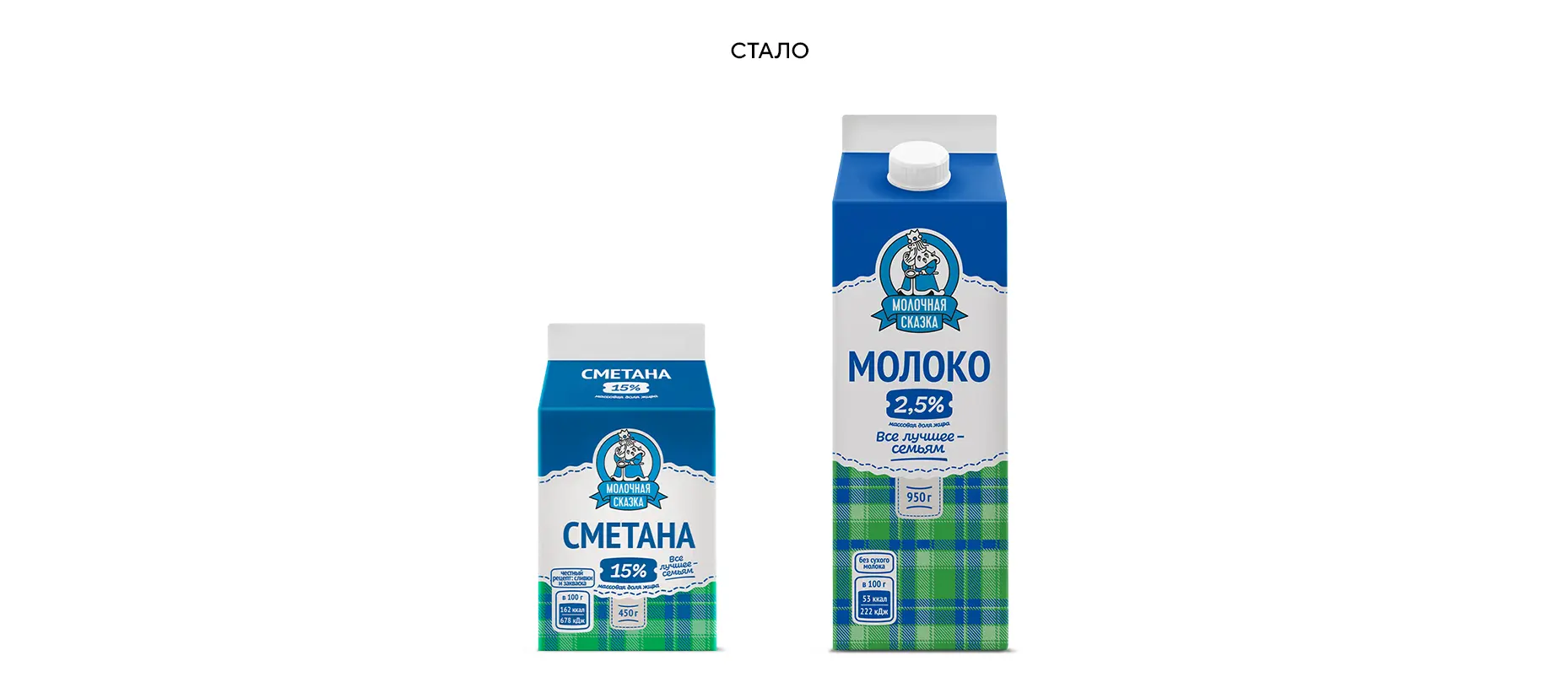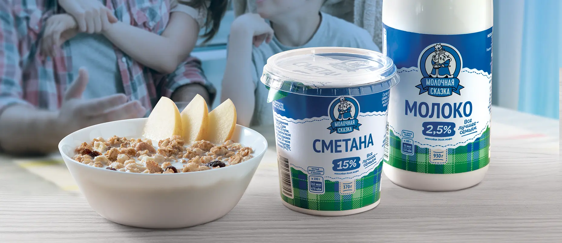 Для ТМ «Молочная сказка» был разработан новый дизайн, который пошел по пути преемственности. Акцент был сделан на сохранении персонажа и визуальных элементов, которые помогают идентифицировать бренд. Скорректированный логотип делает акцент на название бренда, а не производителе, а теплоту коммуникации бренда отразили в копирайте.
