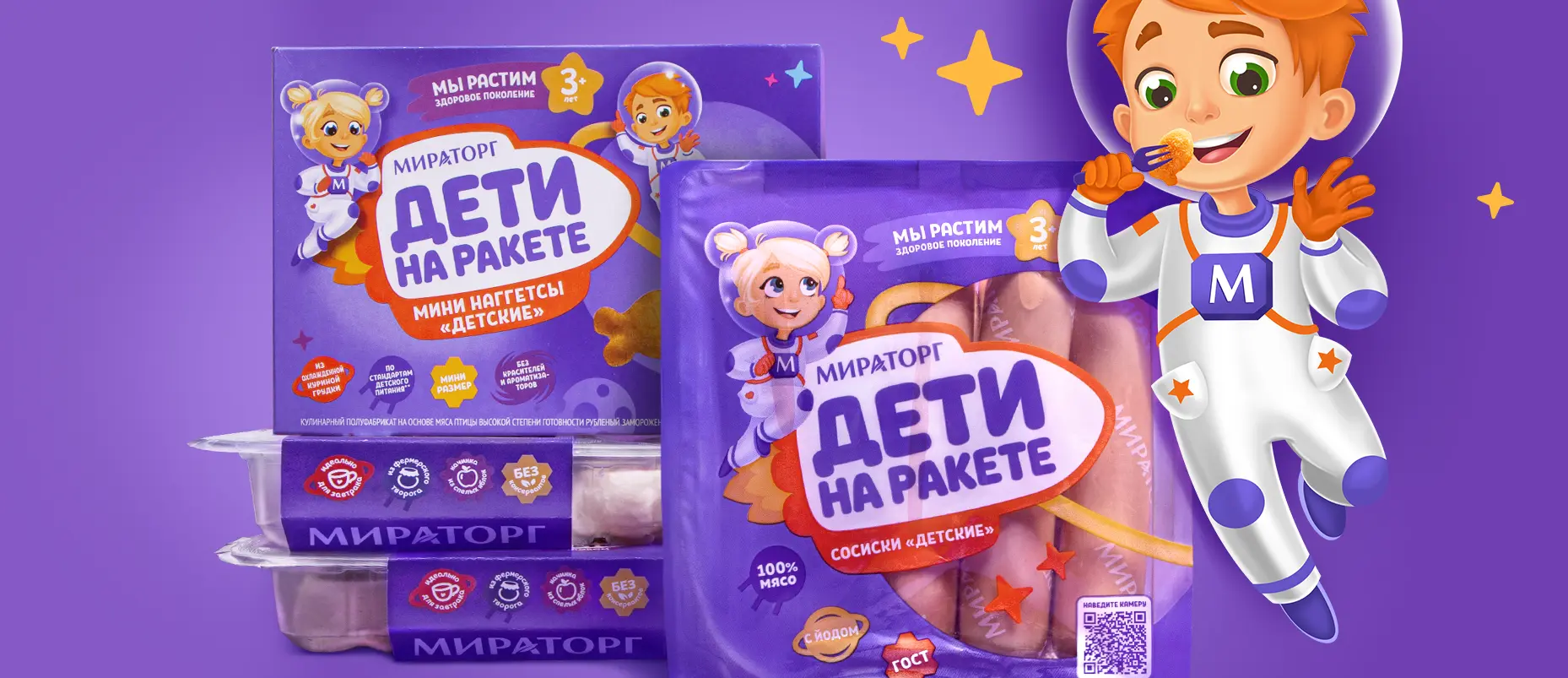 На упаковке изображены два персонажа, космонавты Маша и Митя, которые отправляются на ракете изучать вселенную ЭМ, знакомиться с её обитателями и пробовать новые продукты. Мы использовали мультяшную стилистику, которая максимально релевантна детской аудитории.